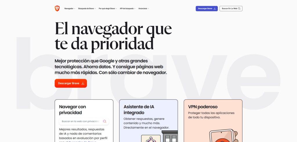 Brave es un navegador que bloquea rastreadores, anuncios invasivos y scripts maliciosos por defecto. Además, permite navegar por la red Tor desde una pestaña privada.